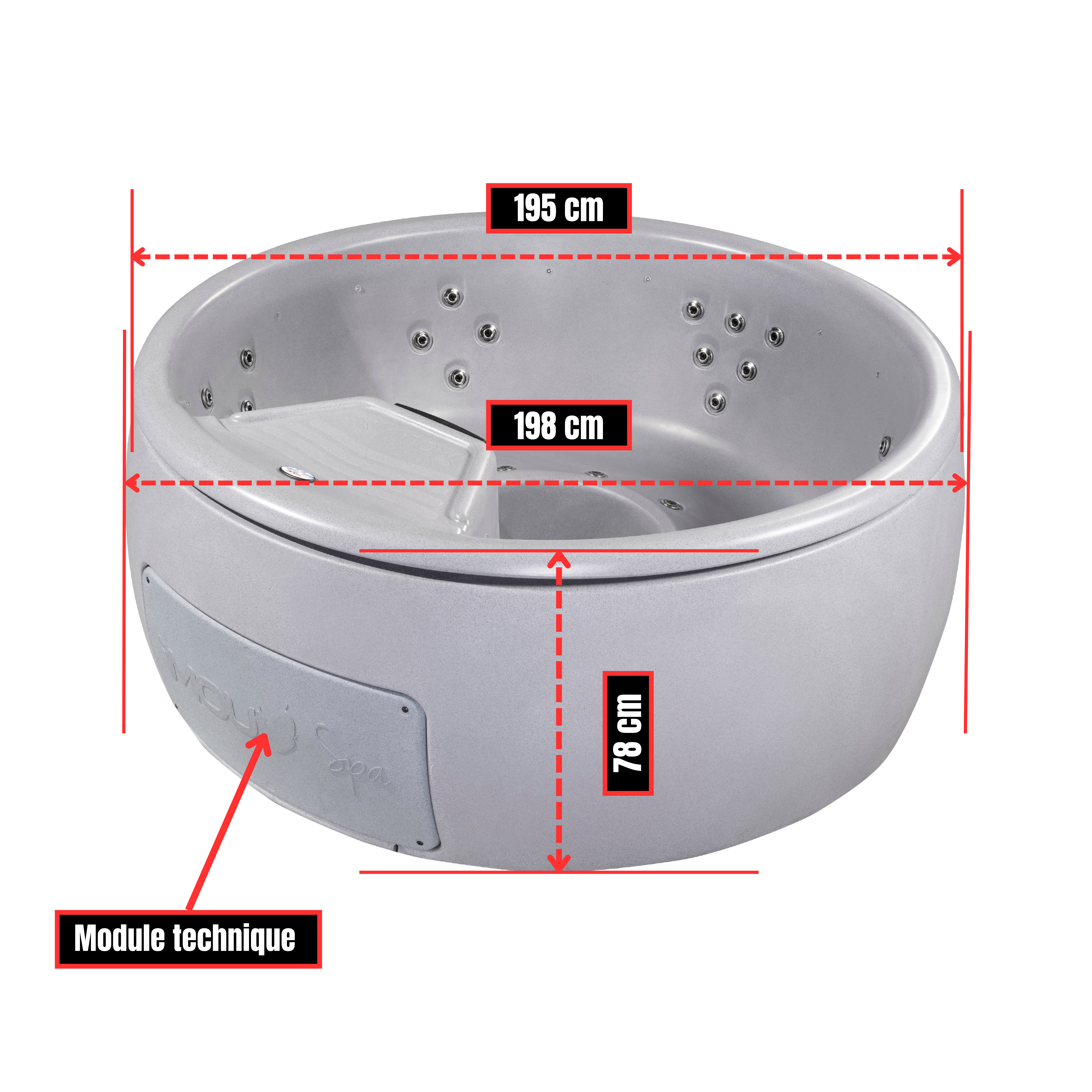 Le Mouv’Spa 4 places rond est facile à installer et prend peu de place. Grâce à ses dimensions réduites (198 x 78 cm), il s’intégrera harmonieusement dans tous vos espaces. Compact et léger, avec un poids total de 150 kg (120 kg pour la coque et 30 kg pour le module technique), il est néanmoins généreux, permettant à 4 adultes de s’y installer confortablement. L’ergonomie de la banquette optimise l’espace et permet à plus de personnes de s’asseoir en même temps.